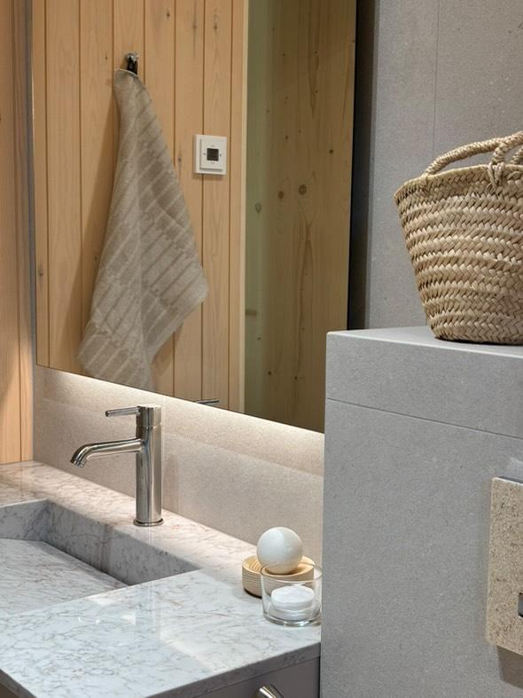 Oulun asuntomessukohteen laattavalinnat muodostuvat niin ajattomista klassikoista kuin trendikkäästä 3D- laatasta. Laattoja on käytetty mm. uniikissa kaksikerroksisessa saunassa, kylpyhuoneessa, Wc- tilassa ja keittiössä.